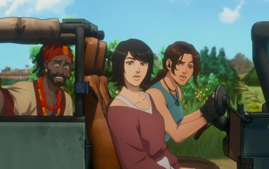 Eshu (O-T Fagbenle), Sam (Karen Fukuhara) and Lara (Hayley Atwell) in "Tomb Raider: The Legend of Lara Croft." Image: Netflix...