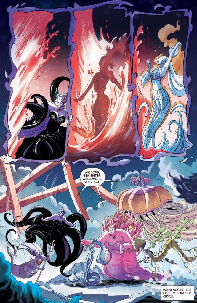 Now being tasked with warning the rest of her siblings, issue 2 of Disney Villains Ursula opened with a flashback to Scylla’s birth from an underwater volcano. Scylla was the youngest of the sisters, and apparantly she hadn’t been too happy about being sent to rule over one of the colder oceans. As Melusine put it, you just don’t do that to a volcano-born witch.