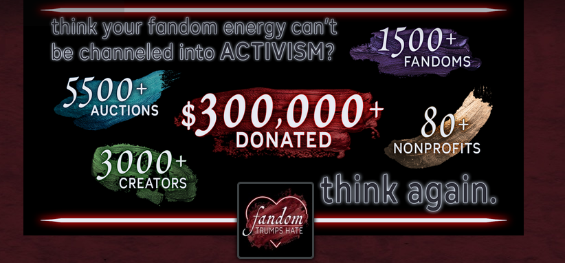 Despite the deluge of bad news on multiple fronts, it is still heartening to see fandom come together to try to take steps to improve the state of the world. While Fandom Trumps Hate and its participants can’t solve all the problems single-handedly, the avenue to help fans use their fandoms to help support organizations doing good work has allowed Fandom Trumps Hate to remain a positive force in fandom activism throughout the years.