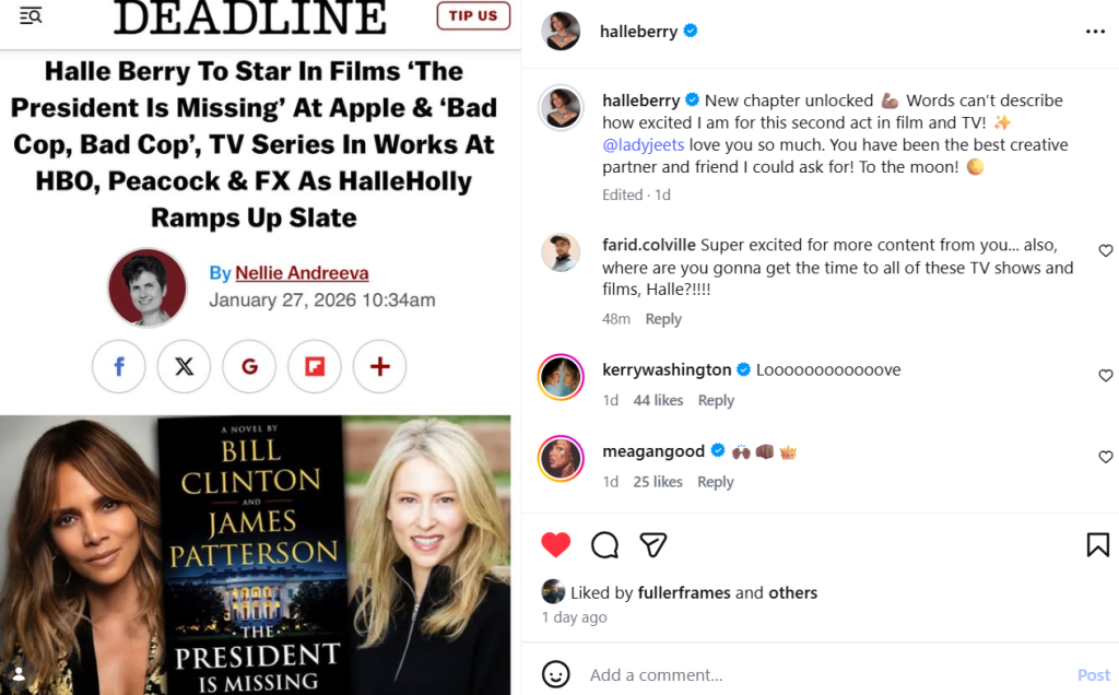 Coming to the newly announced projects, we have action-thriller The President Is Missing, based on the novel by Bill Clinton and James Patterson. Set up at Apple last year, it’s being written for the big screen by Nicole Perlman (Guardians of the Galaxy) and David Chasteen (CIA). Of course, with Berry playing the lead character named President Joanna Duncan, it’s a gender-swapped take on the source material.