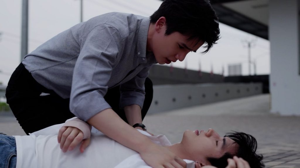 You shouldn’t judge a series by the trailer. That said, in the trailer for My Magic Prophecy, there’s a whole bit about how In isn’t supposed to intervene in someone’s fate. It gave me Marry My Husband vibes; as in, fate cannot be changed but it can be transferred to someone else. The scene of In lying on the ground, intercut with scenes from his dream of Thap bleeding out in the same spot, seems to imply that whatever In has done has given him the same fate as Thap.
