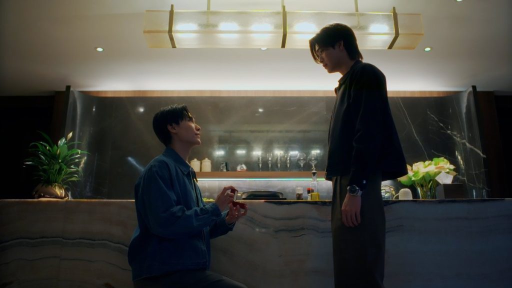 Through a series of time skips, we see the evolution of Tim and Pai’s relationship, which looks to be proceeding at a natural pace. They go on a couple of dates. They’re living together. Then Tim is meeting the family. After a year, Tim is cunningly introducing Pai to the idea of marriage and kids. And it’s only then that we learn that all of this is fake, that Tim is working hard to make Pai fall in love with him while constantly having to remind himself to not do the same.