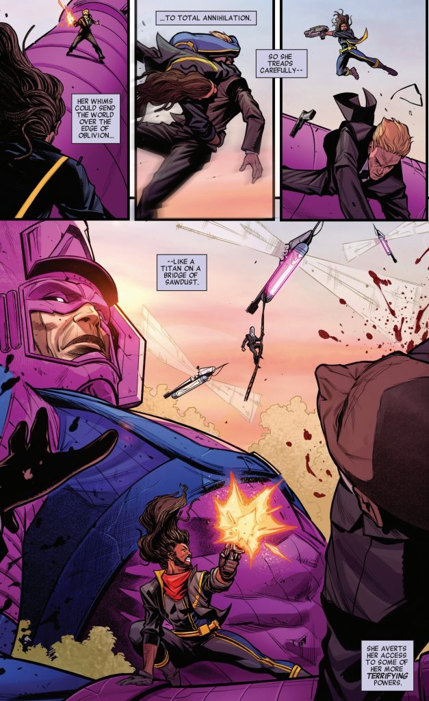 As for Bishop, he showcased some cool action as he beat up a couple of FBI agents. There’s a panel where he jumped crotch-first into a male FBI agent’s face before throwing him away from Galactus’s giant body. I mean, I don’t know about you, but I feel that a talented writer would run with those panels to create a slow-burn romance between Bishop and said FBI agent, layered with narrative deliciousness of mutant and human love, especially with the two standing on opposite sides of the human vs mutantkind battle.