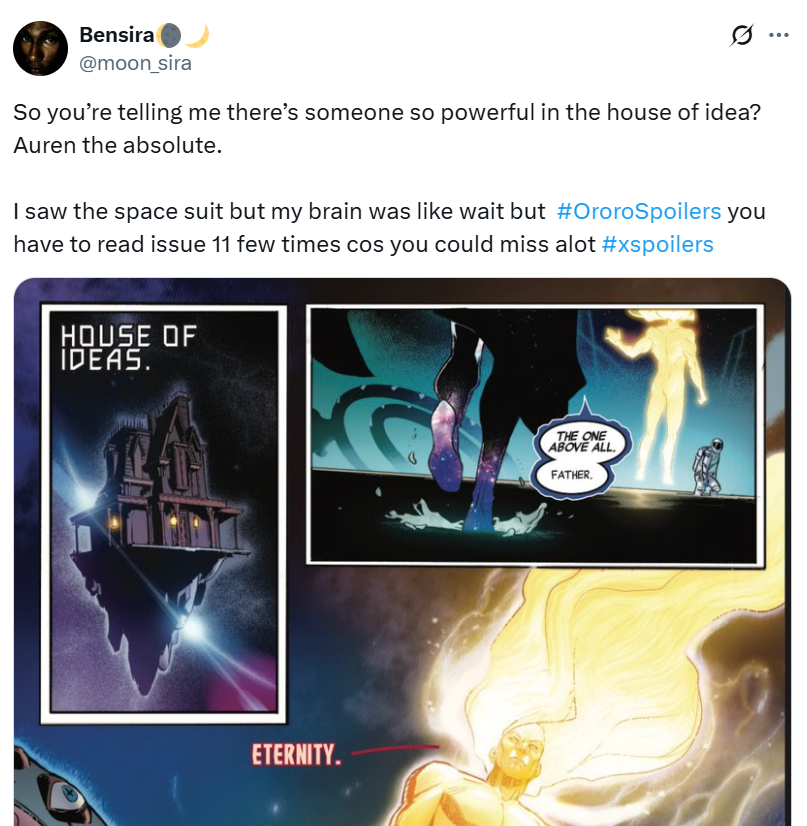 As of right now, I’m willing to assume that Ayodele will feature a flashback of Ororo detecting Eternity’s presence over her. I’m willing to assume that their meeting didn’t go well, and Ororo’s understandable hostility is what drove Eternity to not only leave Storm’s body as his vessel but leave the universe itself to go and ask his father, The One Above All, for help against Hadad. Storm did mention to Infinity she didn’t have the patience to sit through his “cruel, idiotic lessons.”