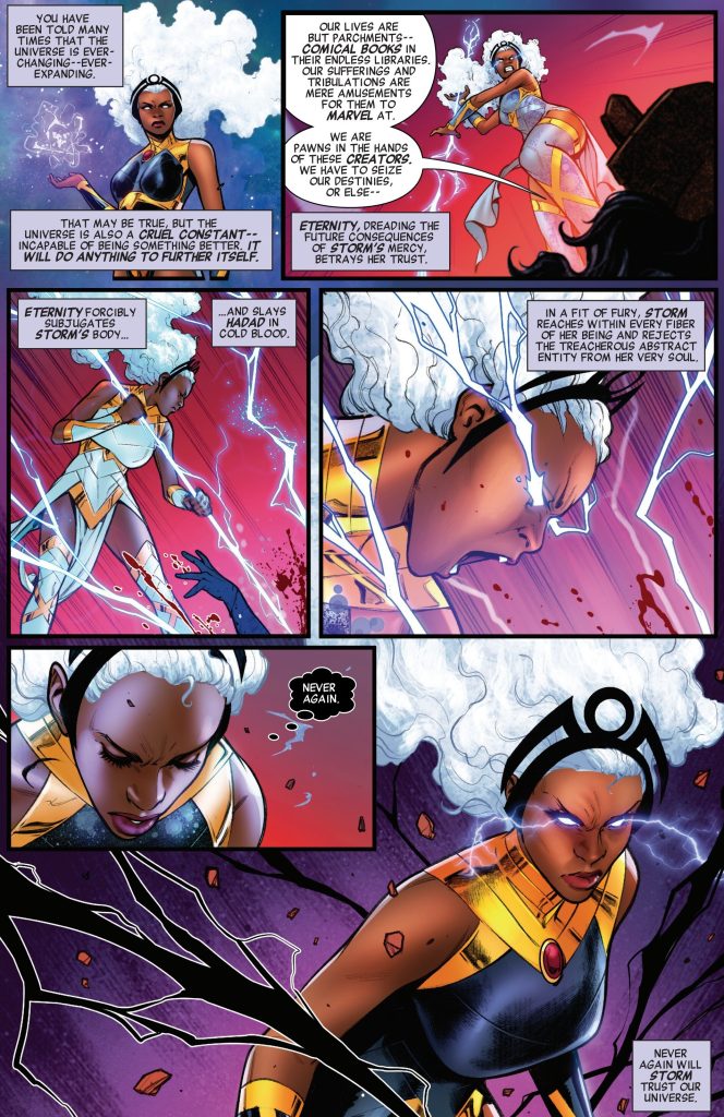 But yeah, before Hadad could continue his speech, Eternity, being freaking Eternity, decided to betray Storm and kill Hadad, going against his promise to never forcefully take over her body and her decision to send Hadad into a pocket dimension housing some of the other Storm Gods instead of ending his life.