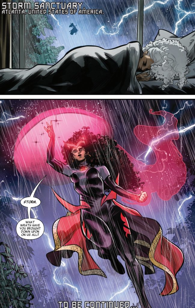 Talking about the magical side of things, we had the Scarlet Witch investigating a couple of mysterious murders that involved something coming out of cellphones and popping people’s heads. Wanda knew that the current events were somehow connected to Ororo. And of course, the debut issue concluded with Wanda visiting Ororo while asking what wrath the Weather Goddess had brought upon them all.