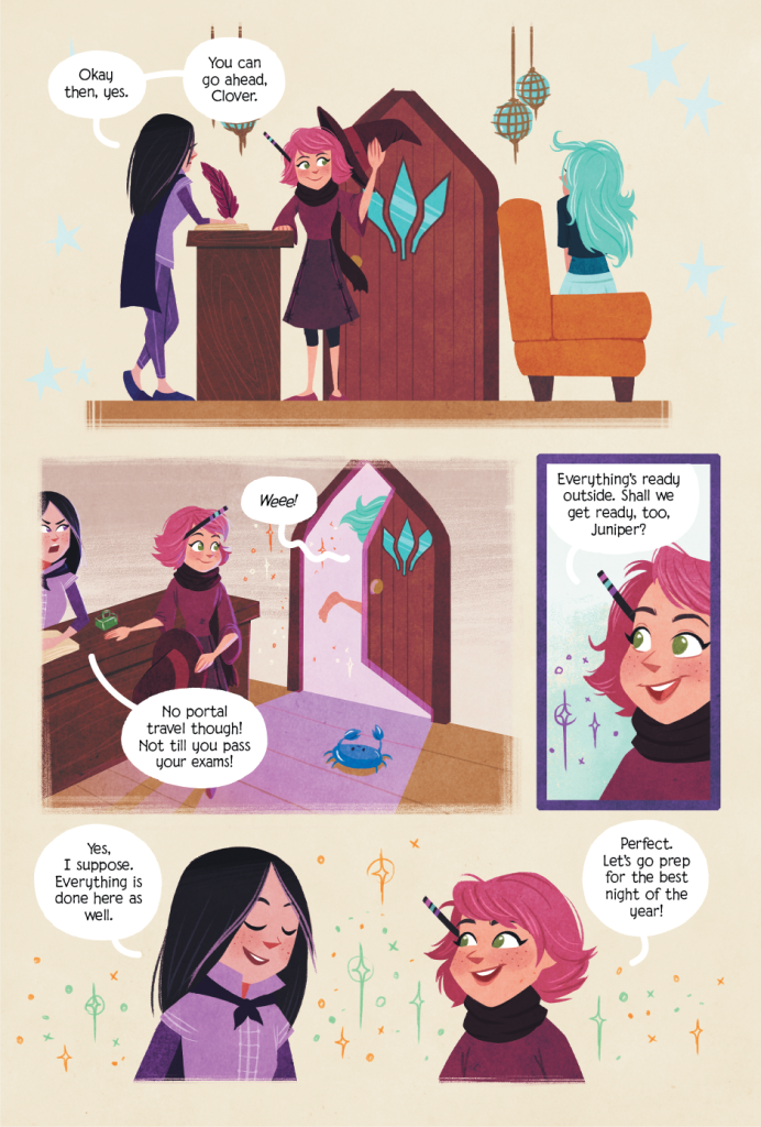 I like the colorful art style. Juniper seems to be the eldest of the sisters. The magical world seems to include vampires, shapeshifting, and magical exams.